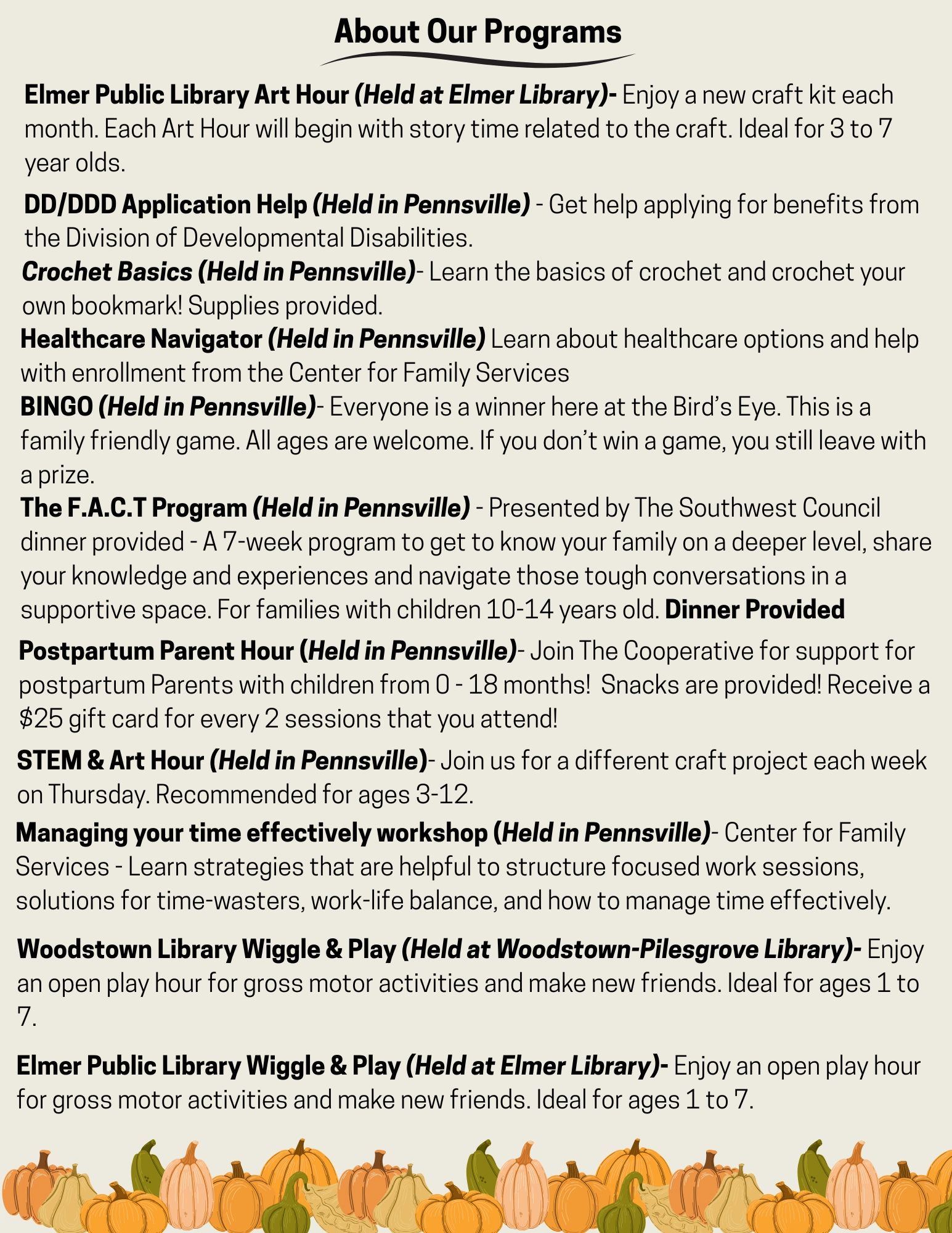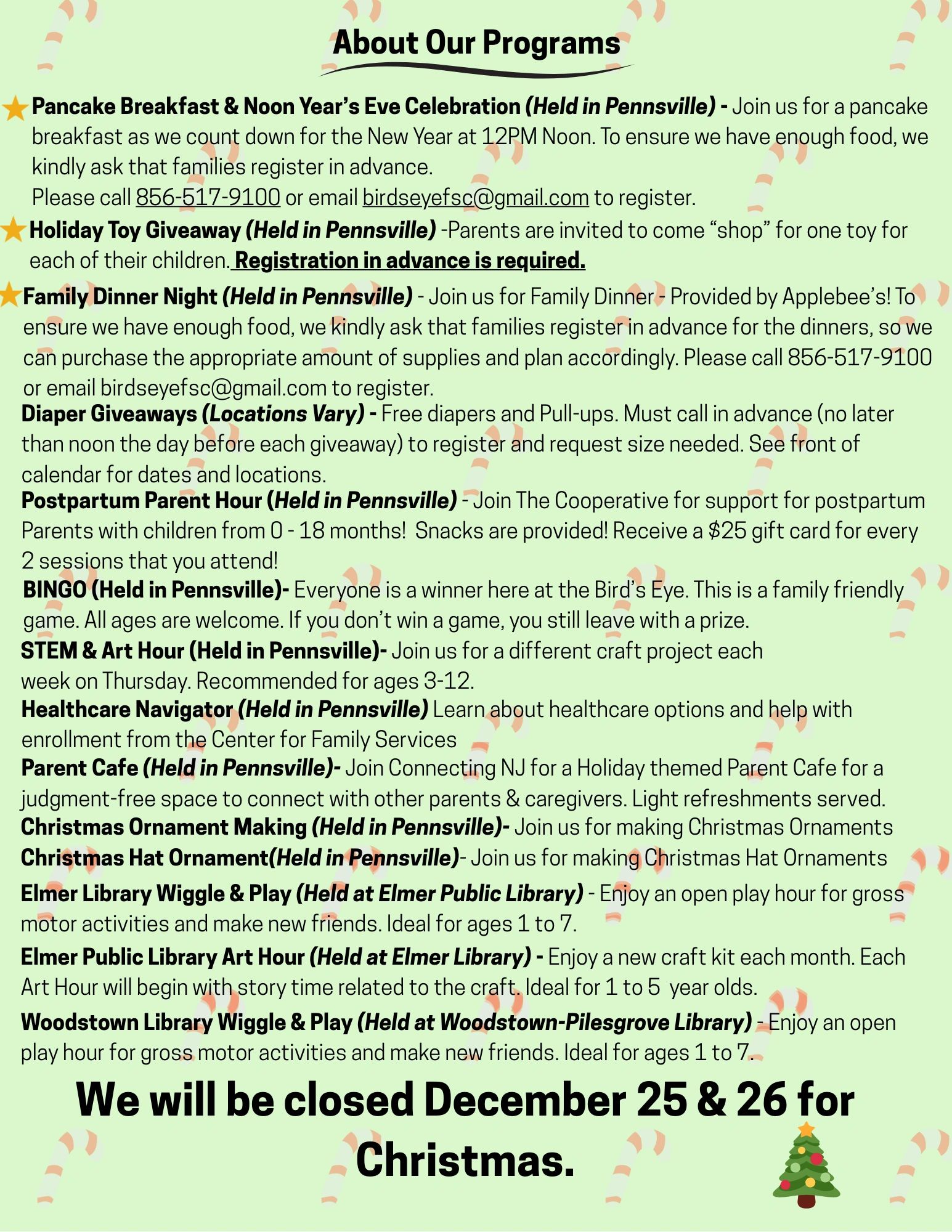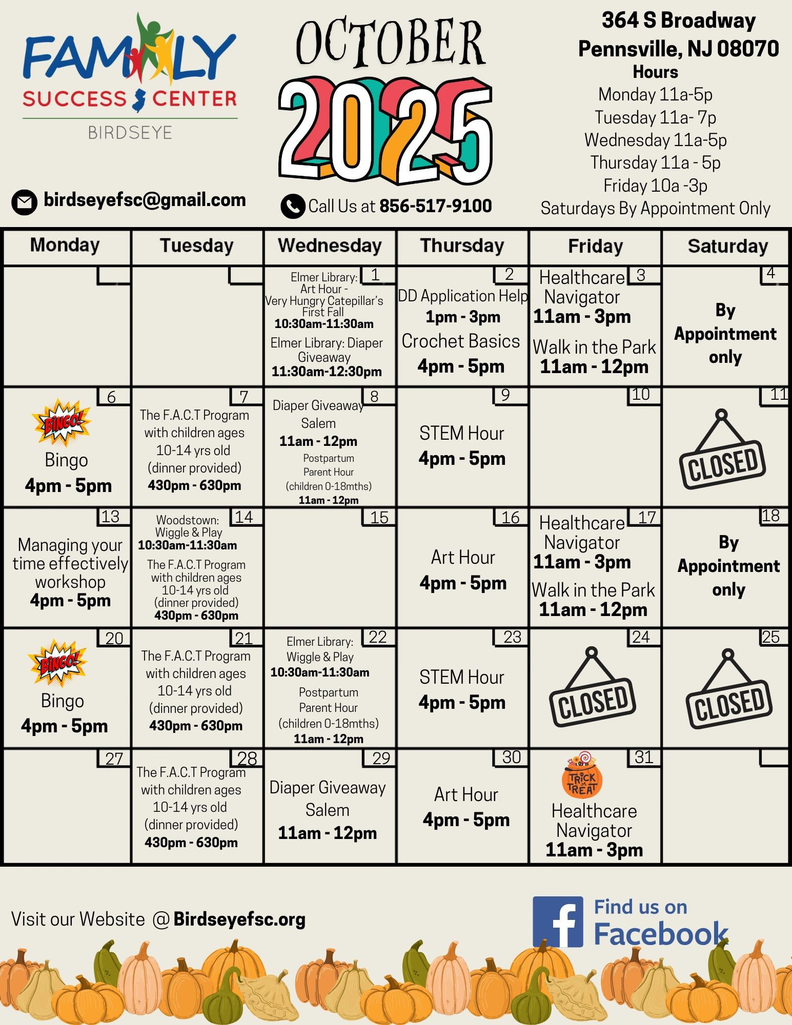 Please check out our Facebook page for updated activities and resources weekly. https://www.facebook.com/BirdsEyeFamilySuccessCenter/